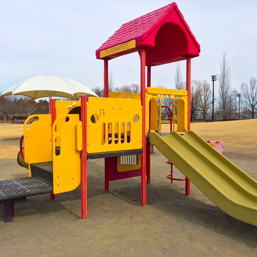 幼児・児童用遊具が設置されています。すべり台やネット遊具、ターザンロープなどがあります。その下には芝生が広がっていて、さまざまな遊びにご利用いただけます。小さなお子様は保護者と一緒に遊んでください。約束を守り、なかよく遊びましょう。