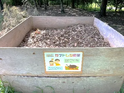 公園内の落葉を堆肥、腐葉土にする取り組み。また、集積所を設けてカブトムシを幼虫から育成し、子どもたちの学習機会も提供。